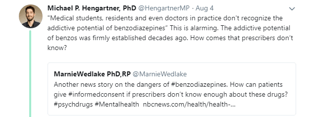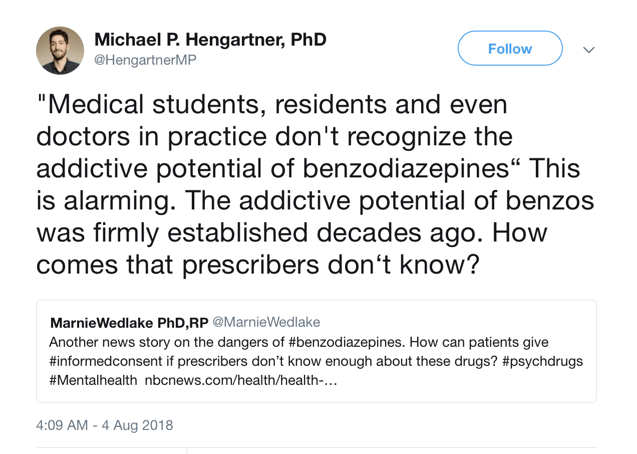 Recently on Twitter, Michael P. Hengartner and Marnie Wedlake both posted critical questions in response to a benzodiazepine news story: